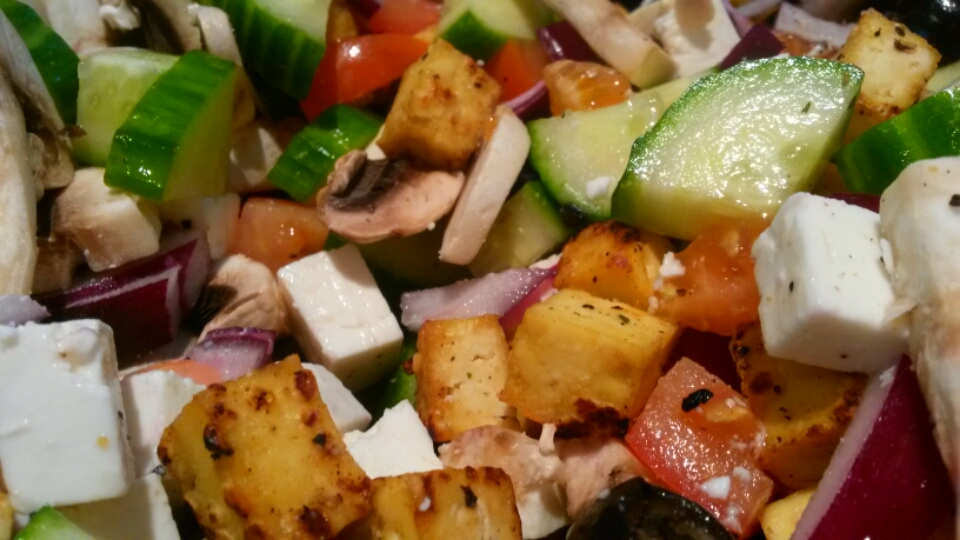 Aujourd'hui on fait donc un petit tour avec ma préférée: salade à la grecque avec tofu :)